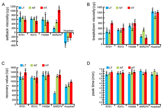 Starch pasting properties as determined by RVA analyses. (A) Setback viscosity. (B) Breakdown viscosity. (C) Recovery value. (D) Peak times of the five restorer lines experiencing HT (high temperature), NT (normal temperature), and LT (low temperature) during the grain-filling stage. The unit of starch viscosity is cp, 1 cp = 1/12 RVU (rapid viscosity units). Data are shown as mean ± standard error of triplicate measurements. Different letters are added above standard deviation to express significant differences (p < 0.05).