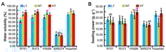 Water solubility index (A) and swelling power (B) of starch particles of the five restorer lines experiencing HT (high temperature), NT (normal temperature), and LT (low temperature) during the grain-filling stage. Data are shown as mean ± standard error of triplicate measurements. Different letters are added above standard deviation to express significant differences (p < 0.05).