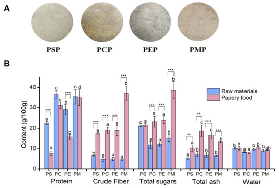 Nutritional composition of four raw materials and P. eryngii papery food. (A) Four P. eryngii papery foods prepared using the papermaking process. (B) The content of protein, crude fiber, total sugars, total ash, and water of raw materials and P. eryngii papery food. Each error bar indicates mean ± SD. The letters of each variable in each sample or raw material are compared. Bars sharing the same letters are not different at p = 0.05. Different letters indicate that the mean values of three replicates are significantly different between the treatments (p < 0.05). The significant differences between the raw materials and papery food were indicated by *. ** refers to significant differences where p < 0.05; *** refers to significant differences where p < 0.01.