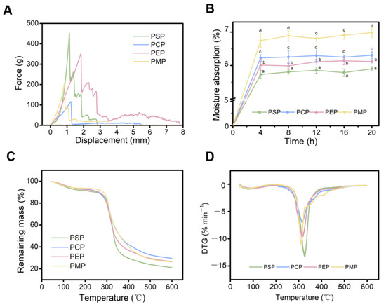 Physical properties of four P. eryngii papery food items. The force–displacement curves (A) and moisture absorption properties (B) of P. eryngii papery food. Thermogravimetric (C) and derivative thermogravimetric (D) curves of P. eryngii papery food. Values are expressed as mean ± standard deviation values. Different letters within the same column indicate significant differences (p < 0.05).