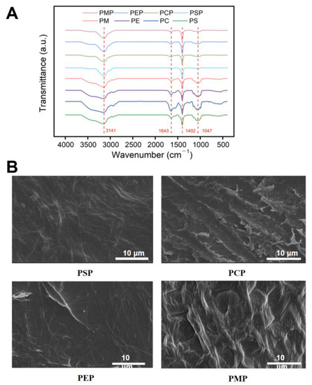 Chemical structure and micromorphology of four P. eryngii papery food items. (A) The FT-IR spectra of raw materials and P. eryngii papery foods. (B) SEM images of the surfaces of four P. eryngii papery foods (PSP, PCP, PEP, and PMP). The magnification level was 5000×.