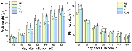 The variation of physiological characters in the ‘Ruixue’ and ‘Ruixianghong’ varieties and their parents apples during fruit development. (A) Fruit weight; (B) fruit firmness. Different lowercase letters in columns denote significant differences between sampling dates for each cultivar by Duncan’s multiple range test (p < 0.05). Different capital letters in columns denote significant differences by Duncan’s multiple range test (p < 0.05) among different cultivars. Different colors represent different cultivars.