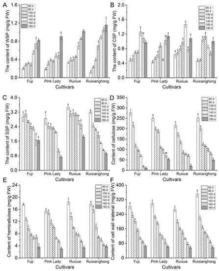 The apple fruits’ CWMs were measured in the four cultivars from 60 DAFB to maturity. The content of CWMs showed a similar declining trend in the four apple varieties during the whole development period. From the fruitlet stage (before 60 DAFB) to the expansion stage (from 80–140 DAFB), the decline was faster, but the decline was slower from the expansion to the maturity stage (140–180 DAFB) (Figure 3F).