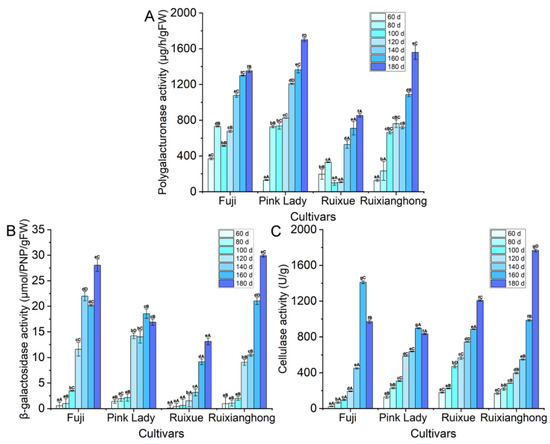 The depolymerization and dissolution of pectin and hemicellulose polysaccharides in the cell wall are the major processes of fruit softening [9], so the key cell wall hydrolases such as PG, β-gal, and CEL activity were determined. At the later stages of development, especially between 140–180 DAFB, the PG enzyme activity of the four cultivars was significantly enhanced (Figure 4A). At the point of maturity, the PG enzyme activity of ‘Ruixue’ variety was significantly lower than those in the remaining varieties. The activities of β-gal were similar in the four apple varieties at the fruitlet stage, but they increased noticeably at the expansion and mature fruit stages. Furthermore, in the period of 180 DAFB, the β-gal enzyme activity of the ‘Ruixianghong’ type was the highest among all of the cultivars, and the β-gal enzyme activity of the ‘Ruixue’ type was significantly lower than those of the other three cultivars (Figure 4B). The cellulase enzyme production showed an increasing trend in the four apple cultivars during the apple fruit development (Figure 4C). In particular, the degradation of SSP by the β-gal and PG enzymes may affect the cell wall structure in the apple fruit. In brief, the decrease in the CWMs may be due to the increased activity of cell wall hydrolysis, which affects the final firmness at the point of maturity of the apple cultivars.