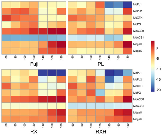 From our previous transcriptomic data [27], we screened the cell wall hydrolase and ethylene related genes, whose expression levels altered significantly during the fruit development. The relative expressions of eight genes were detected in the distinct apple cultivars, and the developmental periods were detected by the qRT-PCR (Figure 7). At the distinct fruit developmental stages, eight genes showed various expression patterns as follows: the relative expression level of MdPL1 increased from low to peak values and then, decreased during the whole developmental phase. Moreover, it reached the maximum expression level at 100 DAFB for the ‘Pink Lady’, ‘Ruixue’, and ‘Ruixianghong’ type, while the ‘Fuji’ one peaked at 140 DAFB. The expression trends of MdPL2 and MdPG during the developmental period are similar, with a trend to first increase and then, decrease from 80 to 140 DAFB; it shows a rapid increase at the later developmental stages in the four cultivars. However, the rising trend of the ‘Fuji’ and ‘Ruixianghong’ types is obviously higher than those of the other two varieties at this expansion stage. In addition, the relative expression of MdXTH decreased rapidly during the developmental phase of the four cultivars, whose expression level was higher in the fruitlet stage in all of the cultivars. Moreover, the expression patterns of two β-gal genes were markedly upregulated in the later stages of development in the four cultivars. Notably, the expression pattern of the Mdβ-gal2 gene was upregulated to a higher degree in the ‘Fuji’ one than it was in the ‘Ruixue’, ‘Ruixianghong’, and ‘Pink Lady’ ones. The expression of MdACO1 and MdACS1 were greatly increased at the later developmental stages, except for the expression of MdACS1 in the ‘Ruixianghong’ and ‘Fuji’ types.