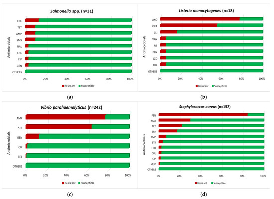 - Ottaviani, D.; Bacchiocchi, I.; Masini, L.; Leoni, F.; Carraturo, A.; Giammarioli, M.; Sbaraglia, G. Antimicrobial susceptibility of potentially pathogenic halophilic vibrios isolated from seafood. Int. J. Antimicrob. Agents 2001, 18, 135–140. [Google Scholar] [CrossRef]