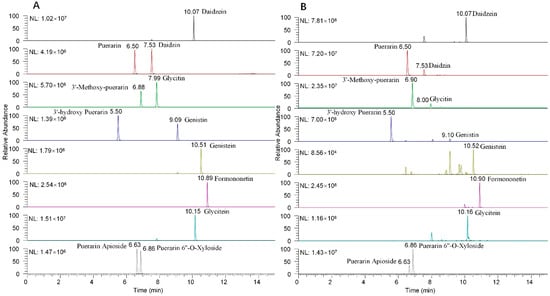 Isoflavones range from non-polar to medium-polar, so an organic modifier is required to raise the polarity of the mobile phase used for isoflavone analysis [31]. Methanol and acetonitrile were assessed for the chromatographic separation of the 12 isoflavones, with acetonitrile giving the better separation and higher response. Addition of formic acid is also known to improve separation and ionization [32]. Aqueous formic acid solutions (0, 0.05, 0.1, 0.2, and 0.3%) were evaluated for the separation of the isoflavones. Peak shape and sensitivity were maximized for the positively ionized compounds in the presence of 0.2% formic acid. Extracted ion chromatograms for the 12 isoflavones in standard solution (A) and sample matrix (B) are shown in Figure 2.