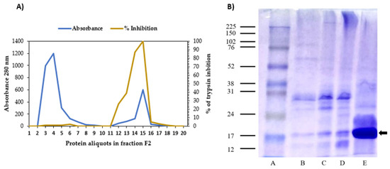 (A) Isolation of trypsin inhibitor from tamarind seeds. A. Chromatographic profile and antitrypsin activity of protein fraction 2 of tamarind seeds by CNBr 4B Trypsin-Sepharose Affinity Chromatography. The blue line represents aliquots of proteins monitored at 280 nm by spectrophotometry, the first peak being the elution of unretained material, and the second peak, the proteins adsorbed on the matrix eluted with HCl (5 mM). The brown line represents the antitrypsin activity, using 100 µL of TTI and 1.25 mM BApNA (Nbenzoyl-DL-arginine-p-nitroanilide) as substrate. (B) This shows 12.5% denaturing polyacrylamide gel electrophoresis (SDS-PAGE) stained with Coomassie blue R-250. A. Molecular Weight Marker Amersham™ ECL™ Rainbow™ Marker—Full range GE Healthcare; B. Crude Extract; C. Protein fraction 1 (saturation using 0–30% ammonium sulfate); D. Protein fraction 2 (saturation with 30–60% ammonium sulfate); E. TTI (tamarind trypsin inhibitor) (arrow).
