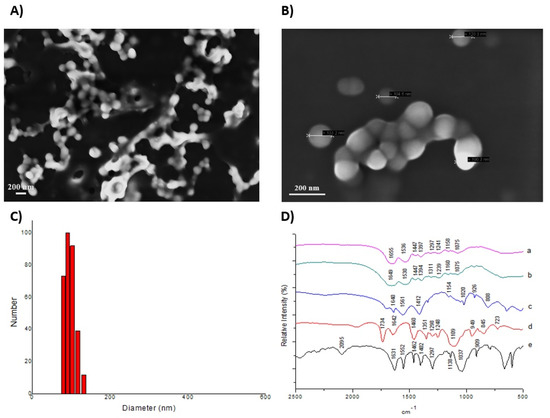 Characterization of ECW. (A) Scanning Electron Microscopy (SEM) with a magnitude of 20.00 KX, a working distance of 4.0 mm, and an acceleration voltage of 3.00 kV. (B) Scanning Electron Microscopy (SEM) with a magnitude of 80.00 KX, a working distance of 4.0 mm, and an acceleration voltage of 3.00 kV. (C) Laser diffraction obtained by crosslinking using formaldehyde and dispersing ECW in water. (D) Fourier Transform Infrared Spectroscopy (FTIR). ECW: TTI encapsulated in purified chitosan and whey protein isolate (1:2:2 w/w/w). (a) EWPI: Whey protein isolate; (b) ECH: purified chitosan; (c) Tween 80; (d) TTI: tamarind trypsin inhibitor; (e) ECW: TTI encapsulated in purified chitosan and whey protein isolate (1:2:2 w/w/w).