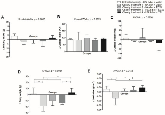 Variation in dietary intake, caloric intake, caloric efficiency, body weight, and nutritional status of Wistar rats with obesity induced by HGLI diet, submitted for ten days to different treatments. (A). Dietary intake variation = final consumed weight—initial consumed weight. (B). Caloric intake (KJ) = final dietary intake (g) × 4.184. (C). Caloric Efficiency = Caloric Intake (KJ) ÷ Body Weight variation. (D). Weight Loss/Gain Variation (g) = final weight—initial weight. (E). Lee index = cubic root of body weight (g)/naso-anal length × 1000). HGLI diet: high glycemic index diet and high glycemic load, a mixture composed of Labina®, condensed milk, and sugar (1:1:0.21 w/w/w); NA diet: nutritionally adequate diet (standard diet) (Labina®); TTI: tamarind trypsin inhibitor; ECW: TTI encapsulated in purified chitosan and whey protein isolated (1:2:2 w/w/w). Values are expressed as mean (standard deviation). Equal letters indicate no significant difference between the groups evaluated for each parameter. The Kolmogorov–Smirnov test was used to assess the normality of the data, the statistical difference using the Kruskal–Wallis test, and the Dunn’s post-test (p < 0.05) for variation in consumption (∆) and variation in caloric intake (∆), and by ANOVA and Tukey’s post-test (p < 0.05) for the changes in caloric efficiency (∆), weight variation (∆), and Lee index variation (∆). Values of p ≤ 0.05 were considered statistically significant (* p < 0.05; ** p < 0.01).