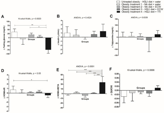 Therefore, only the treatment with TTI showed a significant difference in HOMA-IR compared to the untreated group, the only one with a negative variation for this parameter (Figure 4d). These results impacted the significant difference found for animals treated with TTI and all other groups in the HOMA-BETA analysis. For QUICKI, all groups showed a negative variation (Figure 4f), except for animals treated with TTI but without significant differences. Another highlight can be given to the group treated with ECW and the HGLI diet, which showed a negative mean variation for triglycerides but without significant differences between the other groups (Figure 4c).