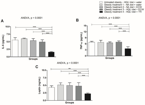 Inflammatory parameters and leptin dosage in obese Wistar rats submitted for ten days to different types of treatment: (A). IL-6; (B). TNF-α; (C). Leptin. HGLI diet: high glycemic index diet and high glycemic load high glycemic index and high glycemic load diet, a mixture composed of Labina®, condensed milk, and sugar (1:1:0.21 w/w/w); NA diet: nutritionally adequate diet (standard diet) (Labina®); TTI: tamarind trypsin inhibitor; ECW: TTI encapsulated in purified chitosan and whey protein isolate (1:2:2 w/w/w). Values are expressed as mean (standard deviation). The Kolmogorov–Smirnov test was used to assess data normality. The statistical difference was evaluated using ANOVA and Tukey’s post-test (p < 0.05) for IL-6, TNF-α, and Leptin. Values of p ≤ 0.05 were considered statistically significant(; ** p < 0.01; *** p < 0.0001).