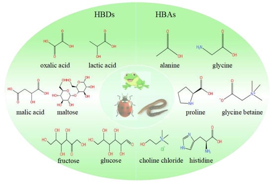 Natural deep eutectic solvent (NADES) is composed of a variety of hydrogen bond donors (HBDs) and hydrogen bond acceptors (HBAs). Typical HBAs include nontoxic quaternary ammonium salts (e. g. choline chloride) and amino acids (e. g. alanine, glycine, proline, histidine, glycine betaine), while HBDs mainly include organic acids (e. g. oxalic acid, lactic acid, malic acid) and carbohydrates (e. g. maltose, fructose, glucose) (Figure 1). Alcohols, amines, aldehydes, ketones and carboxyl groups have dual properties, they can act as either HBA or HBD [5,8]. At present, 135 binary NADESs based on primary metabolites (PRIM) have been discovered [11], which can further form multi-component eutectic solvents, for instance, quaternary or ternary NADESs.