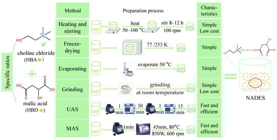 For preparation, NADES is usually synthesized by six physical methods: heating and stirring, freeze-drying, evaporation, grinding, and ultrasound-assisted and microwave-assisted synthesis (Figure 2).