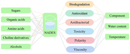 NADES has the characteristics of biodegradation, antioxidation, being antibacterial, low or no toxicity, wide polarity range and high viscosity, which are mainly affected by the components, water content and temperature (Figure 3).