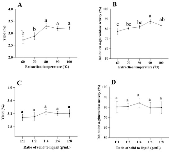Figure 3a,b shows that when the temperature was constant, with the extension of extraction time, the inhibition rate reached the maximum at the threshold level of 1 h, and then decreased. With the increase in the solid-liquid ratio, the inhibition rate also increased, showing the most effective inhibition rate at 1:4.