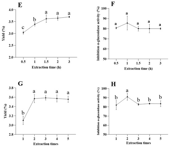 Effects of different extraction temperatures (A,B), solid-liquid ratios (C,D), time (E,F) and number of extraction times (G,H) on the yield of MAP-2 and inhibition of α-glucosidase activity. Each experiment was repeated three times; the error bars are standard deviations; significant (p < 0.05) differences are shown by data bearing different letters (a–c); statistical significances were carried out by ANOVA and Duncan’s test.