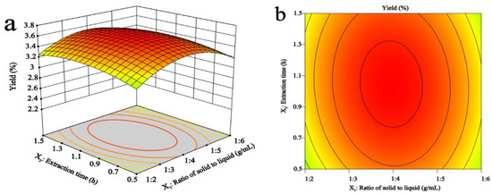 Figure 2a,b shows the 3D response surface MAP and contour MAP drawn under different extraction time and the solid-liquid ratio at a fixed temperature. Within 0.5–1.5 h, the yield of MAP-2 did not change much, and the threshold level of the solid-liquid ratio of 1:4 reached the maximum value.