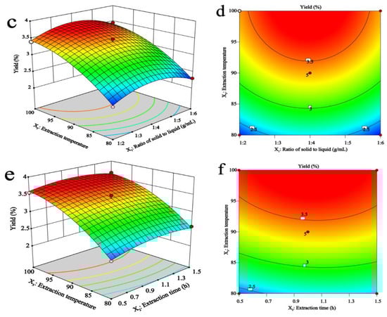 In Figure 2c,d, the extraction time was constant, and the 3D response surface and 2D contour maps of MAP-2 yield were drawn under different extraction temperatures and solid-liquid ratios. The yield increased rapidly with the increase in temperature, and the yield increased gradually with the increase in the solid-liquid ratio, but the yield did not continue to increase but decreased slightly after exceeding 1:5, which meant that the further increase in the solid-liquid ratio did not increase the yield of MAP-2.