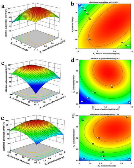 Shown in Figure 3e,f, when the solid-liquid ratio was fixed, the 3D response surface map obtained was steeper with the increase in temperature and time, especially the extraction temperature, indicating that the temperature has a greater impact. When the temperature was 95 °C and 1.2 h, the inhibition rate reached the maximum.