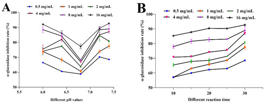 Samples containing 50 μL of different concentrations of MAP-2 sample solution (0.5, 1.0, 2.0, 4.0, 8.0, 16.0 mg/mL), 0.1 U/mL α-glucosidase and 0.5 mmol/L PNPG solution (prepared by 0.1 mol/L PBS with pH 6.0, 6.4, 6.8, 7.2, and 7.4, respectively) were added to 96-well plates, respectively. After shaking, the reaction was carried out at 37 °C for 30 min, and then 100 μL 0.2 mol/L Na2CO3 solution was added. After incubation at 37 °C for 10 min, the absorbance value was measured at 405 nm and the inhibition rate was calculated.