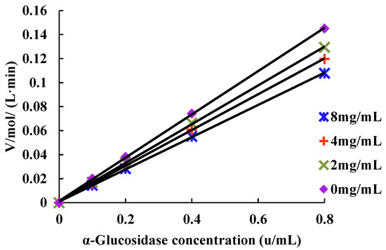 According to the above α-glucosidase inhibition determination method, the mass concentration of MAP-2 was set as 0, 2.0, 4.0, 8.0 mg/mL, the substrate concentration was 1.5 mmol/L, the reaction temperature was 37 °C, and the reaction time was 30 min. The enzymatic reaction rate of different α-glucosidase concentrations (0.1, 0.2, 0.4, 0.8 U/mL) was analyzed (the reaction rate was the ratio of absorbance value to time). The relationship curve between α-glucosidase concentration and enzymatic reaction rate was drawn to determine the reversibility of inhibition [19].
