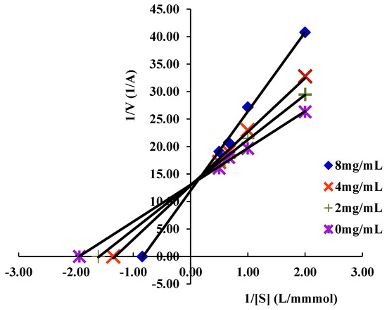 Lineweaver−Burk curve of MAP−2 inhibition of α−glucosidase activity.