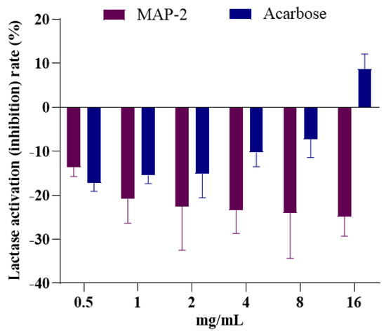 Lactase, also known as β-galactosidase, is one of the important functions of enzymes of the intestinal tract, mainly composed of small intestinal villus and intestinal bacteria secrete of brush border, and closely associated with diarrhea, abdominal distention [33], and studies have shown that, when the body lacks lactase, the symptoms of lactose intolerance occurs [34], such as severe diarrhea, abdominal distension [32], and severe cases can produce dehydration, acidosis and growth disorder, etc. [35]. As a commonly used inhibitor of α-glucosidase, acarbose has adverse reactions such as diarrhea, abdominal distension and abdominal distension [36]. Therefore, in this study, we established a lactase model to compare the effects of MAP-2 and α-glucosidase inhibitors on lactase activity in response to diarrhea, bloating, and abdominal distension in acarbose, as shown in Figure 7. In the range of 0.5–16 mg/mL, MAP-2 not only activated lactase, but also the activation rate increased with the increase in concentration, showing a good dose-effect relationship. The effect of acarbose on lactase was opposite to that of MAP-2; at 0.5 mg/mL, the activation rate of lactose by acarbose was slightly higher than that by MAP-2. However, with the increase in concentration, the activation rate not only decreased but also inhibited the activity of lactase when the concentration increased to 16 mg/mL, leading to lactose intolerance, and causing abdominal distension and abdominal pain in some diabetic patients. However, at present, there are few studies on lactase activity in vitro, especially the effect of polysaccharides on lactase activity is rarely reported. In previous research, it was found that the inhibition rate of MAP-2 on α-glucosidase was significantly higher than that of acarbose at the same concentration, and as an edible plant, Opuntia Milpa Alta is relatively safe [37]. At the same time, it also had a good activation effect on lactase. Therefore, in contrast, as an inhibitor of α-glucosidase, MAP-2 is not only more effective than acarbose, but also far less toxic and has fewer side effects than acarbose. It is an ideal type of α-glucosidase inhibitor for the future.