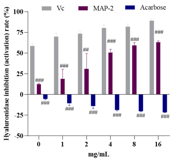 Effects of MAP−2 and Acarbose on hyaluronidase activity. ## p < 0.01, ### p < 0.001.
