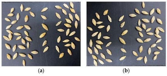 The dataset included nine varieties of barley seed samples. These barley seed images were captured by iOS smartphone iPhone 11 Pro with a 12-mega pixel camera, which is produced by the Apple Computer, Inc in the USA. The barley seeds were small, and there were around 10–90 barley seeds in one photo. Barley seeds were placed on black paper as a background to reduce complex background effects. This study used two types of datasets. One was the multi-barley seed dataset. The multi-barley seed dataset had random amounts and varieties of barley seeds in each image with different angle postures, as shown in Figure 9; we captured 235 photos as multi-barley seed images. The other was the single-barley dataset, collecting the same single-barley seed image for each variety, as shown in Figure 10. The single-barley seed image dataset was photographed initially with 40–50 individual barley seeds uniformly distributed, as shown in Figure 11a. The photographed barley seeds images were segmented into the individual barley seeds of each image, as shown in Figure 11b; we captured 27 photos of the nine varieties of barley seeds, and segmented them into 1080 single-barley seed images. The seed direction was vertical in the single-barley seed images, but multi-barley seeds were randomly placed at different angles. All datasets were photographed on black background paper without blocking each other. The sides of the kernels in the two types of datasets were arbitrary, with both dorsal side kernels and ventral side kernels used. We combined the two types of datasets, the multi-barley seed dataset and the single-barley seed dataset, to achieve high performance of multi-variety barley seed recognition.