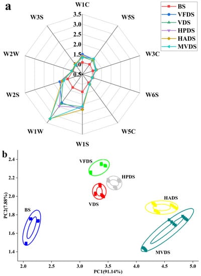 The E-nose system is a fast, simple, and reproducible bionic detection instrument that can determine the overall aroma profile of a sample. Slight changes in the content of volatile compounds in the sample may lead to different sensor responses [21]. As shown in Figure 1a, the response value of the dried shrimp’s sensor was significantly larger than that of BS, indicating that the overall aroma of the dried shrimps was significantly improved. The sensor response values were different between SD-BFDP samples, indicating that the aroma characteristics of the SD-BFDP samples were different. The higher the E-nose sensor response, the more volatile compounds were in the sample. The highest sensor response value was W1W, followed by W1S, W2S, and W5S, indicating that the SD-BFDP samples contained more sulfides, pyrazines, alcohols, aldehydes, ketones, and compounds with methyl groups. In addition, the aroma fingerprint of HADS and MVDS were similar, whereas the aroma fingerprint of VFDS, VDS, and HPDS was similar. However, the response peak intensity of HADS and MVDS at the sensor W1W was significantly higher than that of VFDS, VDS, and HPDS, indicating that the content of sulfide in the two dried shrimps was higher. This may be due to the fact that sulfide-containing compounds were affected by temperature as Maillard reaction products [22].