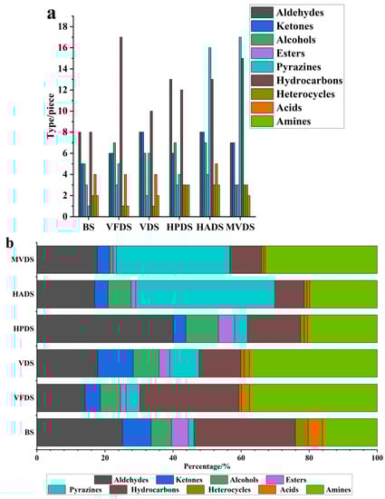 Comparison of volatile compounds in dried shrimps’ samples with different drying methods (a), Comparison of relative contents of volatile components in dried shrimp samples with different drying methods (b). BS: blanching shrimp; VFDS: freeze-dried vacuum shrimp; VDS: vacuum-dried shrimp; HPDS: heat pump-dried shrimp; HADS: hot air-dried shrimp; MVDS: microwave vacuum-dried shrimp.