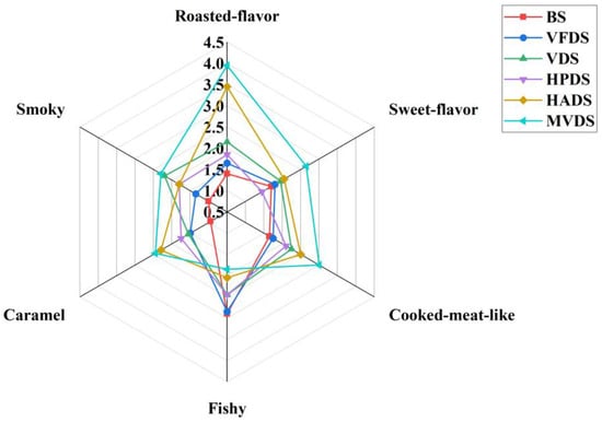 To more intuitively show the flavor differences among the SD-BFDP samples, sensory evaluation was used to analyze the SD-BFDP samples. As shown in Figure 3, compared with BS, the fishy smell score of dried shrimps were decreased, and the other flavor scores were improved to varying degrees. This result indicated that the dried shrimp had a better flavor. This was due to the Maillard reaction producing large amounts of volatile compounds such as pyrazines, aldehydes, ketones, furans, and sulfide-containing thermal processing [38]. Compared with the other four dried shrimps, MVDS had the highest score in roasted-flavor, smoky, caramel, cooked-meat-like, sweet-flavor, and the lowest score in fishy, so MVDS had the best flavor. The HADS score profile was similar to MVDS, but the fishy score was higher than that of MVDS, and the scores of other flavors were slightly lower than MVDS, so the HADS flavor was second to MVDS. The aroma characteristics of HPDS, VDS, and VFDS were similar, and there was no significant difference. However, VDS scores higher in roasted flavor and smoky, so VDS flavor is better than HPDS and VFDS. Among the three dried shrimps, although VFDS had the highest sweet-flavor score, the fishy score was also the highest, which affected the overall flavor of VFDS. The overall aroma of VFDS was weak, so the flavor was the worst. The sensory evaluation results were consistent with those of the E-nose and GC-MS.