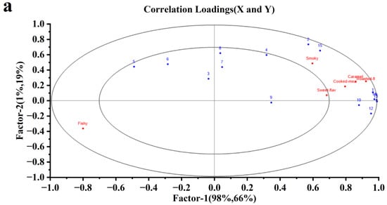 In order to understand the correlation between sensory attributes of different dried shrimps and AACs, PLSR was used to analyze the relationship between sensory attributes an AACs, PLSR has been widely used in correlative sensory and GC datasets [39]. As shown in Figure 4a, AACs were designated as the independent variable, and six sensory attributes (smoky, sweet-flavor, roasted-flavor, cooked-meat-like, caramel, fishy) were designated as dependent variables. The derived PLSR model between the AACs and sensory attribute matrices explained 99% and 85% of the variance in X (AACs) and Y (sensory attributes), respectively. Except for heptanal, octanal, nonanal, (E, Z)-2,6-nonadienal, 2-nonanone, octanol, 1-octen-3-ol, the rest of the AACs and sensory attributes were located between the small and large ellipses. The results showed that AACs between two ellipses could be considered to correlate with sensory attributes, while the seven AACs within the small ellipse were poorly correlated. Hexanal and trimethylamine were positively correlated with smoky. 3-methylbutanal, 2,5-dimethylpyrazine, 3-ethyl-2,5-dimethylpyrazine, 2,3,5-trimethylpyrazine, 2-ethyl-5-methylpyrazine, 2-ethyl-3,5-dimethylpyrazine were positively correlated with caramel, cooked-meat-like and roasted-flavor. PLSR results were consistent with sensory assessment and AACs results.