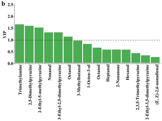 The contribution of each variable to the sample was quantified according to the variable importance in the project (VIP) in the PLS-DA model, and the volatile components with VIP > 1 were called signature aroma compounds. In previous studies, volatile compounds with VIP > 1 were considered to be the key aroma compounds of sugar-smoked chicken legs [40]. The larger the VIP, the more significant the difference in the content of this volatile component among the SD-BFDP samples, which means that different drying methods have a greater impact on the volatile components of dried shrimp. As shown in Figure 4b, six AACs with VIP > 1 were identified, namely trimethylamine, 2,5-dimethylpyrazine, 2-ethyl-5-methylpyrazine, nonanal, 3-ethyl-2,5-dimethylpyrazine, and octanal, which could be used as signature aroma compounds to distinguish five different dried shrimps. Trimethylamine and 2,5-dimethylpyrazine were also considered to be the signature flavor compounds of stored shrimp heads [41].