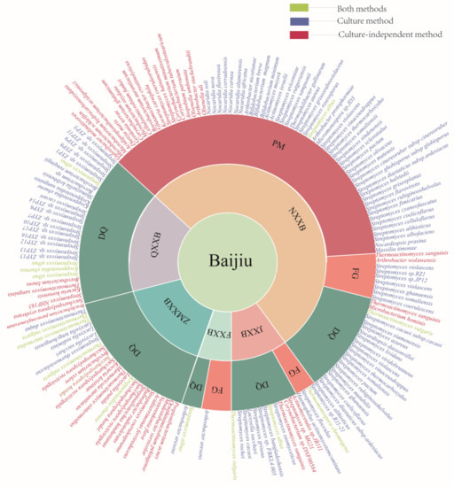 Acomparison of actinomycetes identified by culture and culture-independent methods is shown in Table S2. Thermoactinomyces vulgaris, Streptomyces albus, Thermoactinomyces intermedius, Thermostaphylospora chromogena, Kroppenstedtia eburnea, and Streptomyces cacaoi were identified by both methods. Eighty species were detected and identified by culture-independent methods, of which 55 species were detected without isolation. There are four major differences between the two methods: (i) the analyzed samples were from many different locations and sampling times; (ii) the isolation medium of actinomycetes were limited by traditional culture methods; (iii) metagenomics analysis of most samples by the cultured-independent methods could only assign the taxonomic classification of actinomycetes to genera; and (iv) low-abundance actinomycetes cannot be detected by targeted metagenomics such as 16S rRNA amplicon sequencing. To understand the diversity of actinomycetes within the Baijiu microbiome of a limited time, multi-omics analysis and more separation methods should be applied [75,76]. Further, combined with innovative techniques (high-throughput culture), uncultured actinomycetes should be targeted for isolation according to their special functional characteristics [77]. With the help of high-throughput analysis results, selective nutrient media, selective physicochemical conditions, density-based separation, inhibitors, and specific growth factors could be found to isolate the uncultured actinomycetes from the DQ, FGs, and PM of the different Baijiu ecosystems [77].