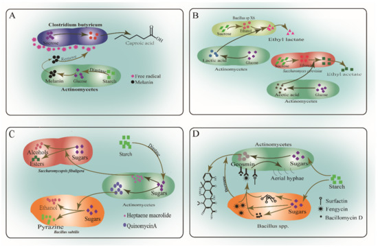 Interspecies interactions of actinomycetes. (A) Actinomycetes produce diastase to convertstarch into melanin that scavenges free radicals around C. butyricum. (B) Acetic acid and lactic acid produced by actinomycetes promote ethyl caproate and ethyl lactate production by yeasts and Bacillus. (C) Antibiotics produced by actinomycetes inhibit yeasts, promoting alcohol and pyrazine production by Bacillus. (D) Bacillus produces lipopeptides that inhibit the growth of Streptomyces and reduce geosmin production.