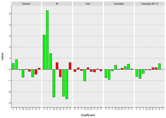 Comparison of coefficient estimates in terms of coded factors. The colors of the bars indicate the significance of each term: green for significant terms, red for non-significant terms. KI, Kolbach index; AAL, apparent attenuation limit; A, germination time; B, germination temperature; C, degree of steeping.