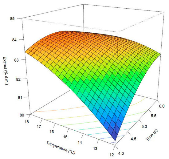 The adjusted R squared was high and close to the unit (0.937), and the lack of fit was not significant (p-value: 0.9103533). Germination time and temperature exerted a major role in the response. They both presented positive coefficients, which means increasing A or B determined a consequent increase in the predicted response. Nonetheless, their interaction was also significant. Its coefficient presented a negative sign, which means the effect of A on the response will decrease by raising B and vice versa. The quadratic coefficients for the same parameters were also significant. The degree of steeping did not exert any significant influence on the extract, and for this reason, it was not considered in the model. Figure 2 shows the 3D surface of the predicted response based on the fitted model. It was possible to identify a point near-maximum at about 5 days at 18 °C. Predicted extracts equal to 83.7% could be obtained for temperatures comprised between about 17 and 18 °C and for germination times ranging from 4.5 to 5.5 days.