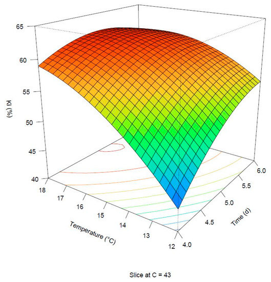 The adjusted R squared was equal to 0.946, which means most of the variability observed was explained by the selected model. The lack of fit was not significant (p-value: 0.128669). All the linear terms were significant, with the germination temperature exerting the strongest influence on the response (Figure 1). The interaction term between germination time and the temperature was also significant, and the coefficient presented a negative sign. They both contributed to influencing the KI response; for this reason, the effect of A on KI resulted less strong with a concurrent increase in B and vice versa. There was a discrepancy regarding the combination of experimental settings allowing to reach the maximum response if observed and predicted values were compared. In fact, the maximum KI (62.2%) was predicted at 6 days, 18 °C and 46 g/100 g. Nonetheless, an area of maximum predicted response (>62.0%) has been predicted by the fitted model in the range 5–5.5 days and 17–18 °C when the degree of steeping was held at a constant level of 43 g/100 g, as depicted in Figure 3.