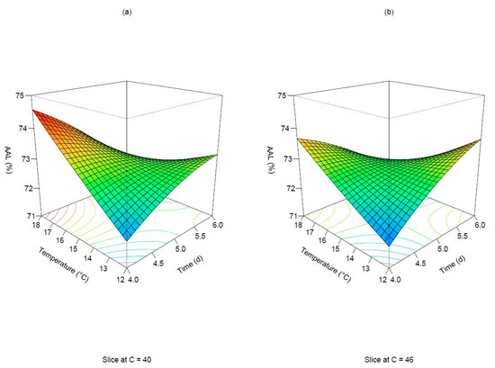 The apparent attenuation limit measured in the Congress wort represents the difference in extract before and after fermentation [40]. In particular, the term attenuation refers to the decrease in the specific gravity of the wort and thus its sugar content after fermentation [28]. The recommended value for barley malt is over 80% [56]. The observed responses were in the range of 71.5–74.7%. The minimum value was reached at 6 days, 18 °C and 46 g/100 g, while the maximum value was reached at 4 days, 18 °C and 40 g/100 g. An average AAL of 73.0% was obtained at the central points of the experimental region. The second-order model describing the AAL response is shown as follows: