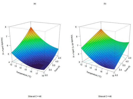 Surface plots of viscosities. Predicted viscosities in Congress (a) and isothermal mash (b) when the degree of steeping is held at 46 g/100 g.