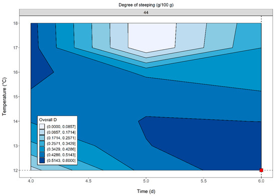 Indeed, maximum desirability values were obtained for the same degree of steeping but at opposite levels for the temperature and time parameters. Thus, at a fixed degree of steeping of 44%, satisfactory responses meeting the above criteria can be obtained by combining long germination times at low temperatures, or alternatively for shorter germination periods at higher temperatures. The highest value computed by the function was 0.568 at 6 days, 12 °C and 44 g/100 g. The following optimized responses were predicted for this combination of parameters: extract 82.7% d.m.; KI 55.6%; AAL 73.6%; viscosity 5.27 mPa × s; viscosity (65 °C) 7.07 mPa × s.
