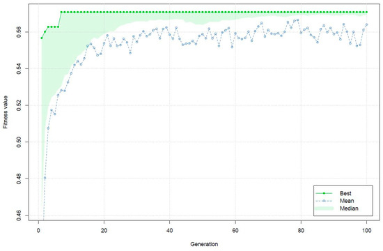 A genetic algorithm was applied to find a global optimum implementing the desirability function specified above as the fitness function. Specific information on the definition and typologies of genetic operators can be found in the ‘GA’ package [35]. In the case of optimization problems, the type of genetic algorithm is defined as ‘real-valued’; the minimum and maximum limits of the search space were defined within the boundaries of the experimental design; the population function was defined as ‘gareal_population’, which generates a random and uniform population of real values within the constraints of the search space; selection was defined as ‘gareal_lsSelection’; the genetic operator crossover was chosen as ‘gareal_laCrossover’ which stands for local arithmetic crossover; mutation was defined as “gareal_raMutation” which stands for random and uniform mutation; the elitism operator, equal to the number of individuals with the best fitness surviving each generation or iteration, was set to 5%; the number of individuals within the population was set to 100; the maximum number of iterations was equal to 100; the probability of crossover was set at 0.8; the probability of a mutation occurring within a parent chromosome was set at 0.1; a specific seed was set to generate reproducible results. Each chromosome consisted of combinations of the three independent variables. For each specific combination of parameters within a chromosome, a predicted response was obtained, the fit of which was assessed by means of the fitness function. The worst solution had an overall desirability of 0.4081. After the 7th iteration, the best solution of 0.5709 was identified. Thereafter, no improvement was detected during subsequent iterations (Figure 7).
