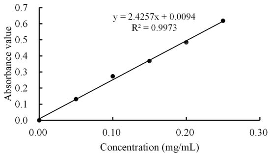 The lysozyme content was determined according to the method of Amaly et al. [22], with slight changes. The experiment used 0.90% NaCl solution as the reference solution. An analytical balance was used to weigh 0.50 g of standard lysozyme accurately and this was added to 0.90% NaCl to prepare a 0.50 mg/mL solution. Next, 1, 2, 3, 4, and 5 mL of lysozyme solution were placed in 10 mL stopped colorimetric tubes. The NaCl solution (0.90%) was added to each of these tubes until the final volume was 10 mL. The absorbance of the sample solution was measured successively at 281 nm. Three groups of parallel experiments were conducted to take the average value and draw the standard curve. The standard curve equation was y = 2.4257x + 0.0094 (R2 = 0.9973, Figure 1). The error of the slope was 0.0822 and the error of interception was 0.0136. The lysozyme concentration was calculated using the regression equation of the standard curve.