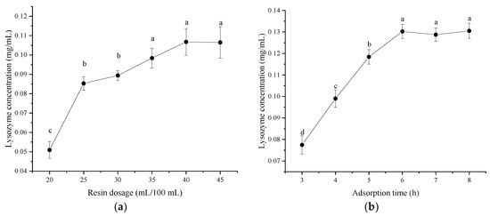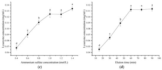Effect of single factor on the concentration of lysozyme from salted duck egg white (SDEW). (a) Resin dosage, (b) adsorption time, (c) ammonium sulfate concentration; (d) elution time. Different lowercase letters (a–d) in the same graph represent significant differences (p < 0.05).