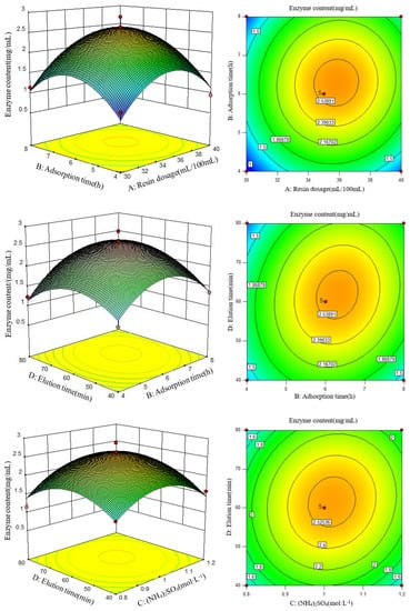 The Box–Behnken test was further conducted to optimize the experimental conditions. The experimental design and results are shown in Table 2 and Table 3. The multiple regression equation obtained by fitting was as follows: enzyme concentration = 2.57 + 0.22A + 0.18B + 0.097C + 0.067D + 0.081 AB − 0.038AC + 0.058AD + (5.263E − 0.003) BC + 0.16BD + 0.11CD − 0.73A2 − 0.66 B2 − 0.55 C2 − 0.50 D2. (A: resin dosage, B: adsorption time, C: (NH4)2SO4 concentration; D: elution time).