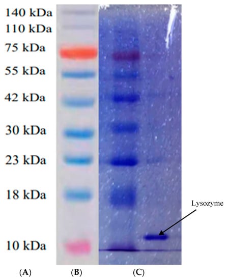 SDS-PAGE profile of lysozyme from SDEW. (A) Protein molecular quality standard, (B) standard protein Marker; (C) sample.
