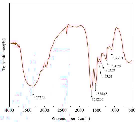 The FTIR spectrum of lysozyme from SDEW is shown in Figure 6. The spectrum shows good characteristic absorption peaks, in particular 1652 cm−1 attributed to the amide I band (1600–1700 cm−1) and 1234 cm−1 to the amide III band (1220–1330 cm−1). Two characteristic absorption peaks contain secondary structure information for lysozyme, including β-fold, α-helix, irregular curl, and β-turn [28]. The amide I band (1600–1700 cm−1) was related to the C=O stretching vibration in the FTIR spectrum. By second derivative analysis and peak fitting, one α-helix and three β-turn absorption peaks can be obtained. By the same method, four characteristic peaks can be obtained for the amide III bands (Table 4). The relative content of the SDWE lysozyme secondary structure was analyzed using a combination of amide I and amide III bands. The result shows that the relative content of SDEW lysozyme was 0.06 for β-sheet, 0.10 for α-helix, 0.82 for β-turn, and 0.02 for irregular curl, respectively. The results were similar to the secondary structure of natural lysozyme and suggested that the hydrogen bonding network of SDEW lysozyme was not disrupted after desalination. Therefore, lysozyme extracted from SDEW has as good an application as any other natural lysozyme source.