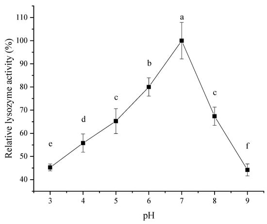 As shown in Figure 7, the effect of pH on the activity of lysozyme extracted from SDEW increased initially and then decreased. When the pH was 7, the lysozyme activity reached its maximum. Therefore, the optimal pH of lysozyme in SDEW was about 7. This change in lysozyme activity may be because SDEW lysozyme was positively charged under alkaline conditions at pH < 10. As the pH of the solution approached the isoelectric point of lysozyme (pI > 10), the charge of lysozyme reduced and had less opportunity to bind to the substrate, resulting in reduced activity. Thus, changes in pH resulted in changes in the charged state of lysozyme, which in turn resulted in changes in enzyme activity [29].
